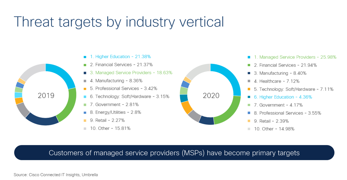 Shifts in the distribution of threat traffic across different business markets since 2019 offer further insight into how to secure your enterprise. In particular, managed service providers (MSPs) have now surpassed financial services as the most impacted markets. In fact, U.S. government agencies have issued recent warnings about the heightened risk of attacks by state actors on MSPs.