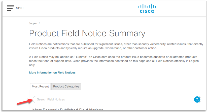 Product Field Notice Summary: for the latest published Field Notices or to search for Field Notices related to specific products.