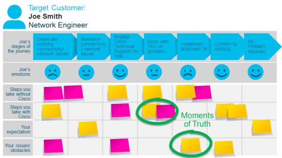 Finally, the last and most important part of journey mapping is identifying the “Moments of Truth,” which are determined by asking our customers to call out areas where Cisco has to get it right, and areas where Cisco must improve in order for them to accomplish their goals. We then elevate and prioritize these areas internally to ensure that we improve what YOU, our valued customers and partners, feel is most important.
