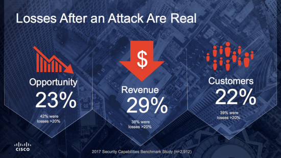 Right now, it is estimated that nearly 50 percent of organizations are under public scrutiny due to security breaches. [1] These incidents lead to huge losses for businesses and consumers, and can profoundly damage brand loyalty and customers’ trust. According to Cisco’s 2017 Cybersecurity Report, 23 percent of surveyed security professionals experienced a loss in business opportunity, 29 percent saw a decrease in overall revenue, and 22 percent said they lost customers after experiencing a breach in their companies.