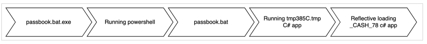 The entire loading process appears as though passbook.bat.exe is executing PowerShell, which is deobfuscating passbook.bat. This, in turn, is running the tmp385C.tmp (tmp385C.tmp is just a header file name) C# applications, which reflectively load the _CASH_78 C# application. The final application in this sequence is the Agniane Stealer: