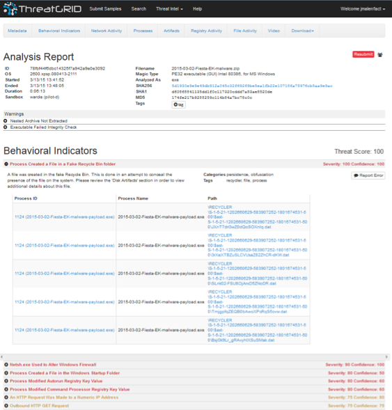The AMP Threat Grid portal provides a Threat Score and easy to read behavioral indicators that very simply spell out why something is bad, helping them make more accurate decisions faster. This is where analysts can dive into the analysis, interact with the malware samples in GloveBox, find if a suspicious sample is actually communicating with known bad IPs or Domains, download the artifacts it created and submit those, and so much more!