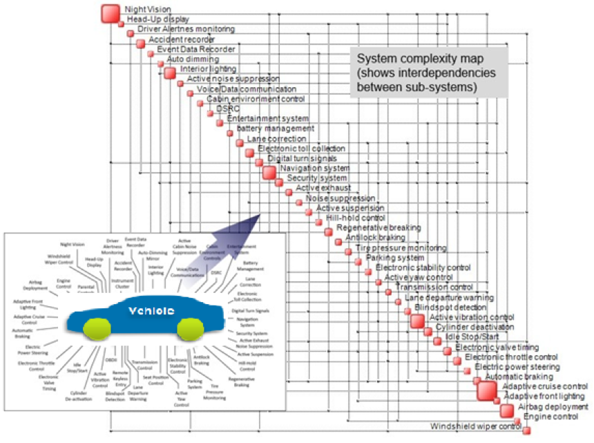 An example of a Complexity Map, illustrated below, is relative to the software/electronics subsystem in a car. The map is synthesized in real-time using sensor data taken from the CAN bus.