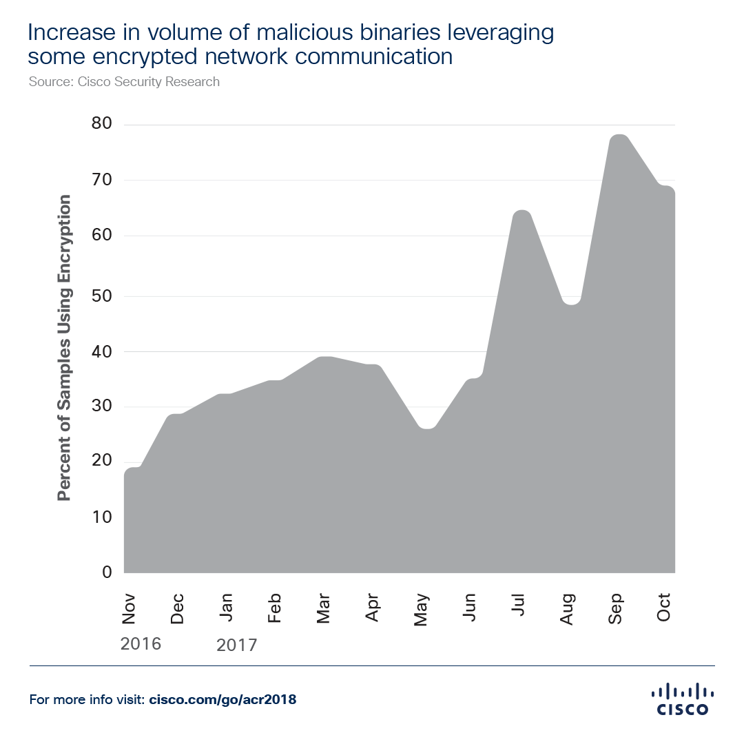 Consider these findings, presented in our new report: Over a 12-month period beginning in November 2016, Cisco threat researchers observed a more than threefold increase in encrypted network communication used by inspected malware samples (see below). And our analysis of more than 400,000 malicious binaries found that about 70 percent had used at least some encryption as of October 2017.