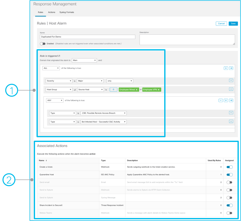 - Actions: Response actions that are associated with specific rules and are used to perform specific types of actions when triggered.