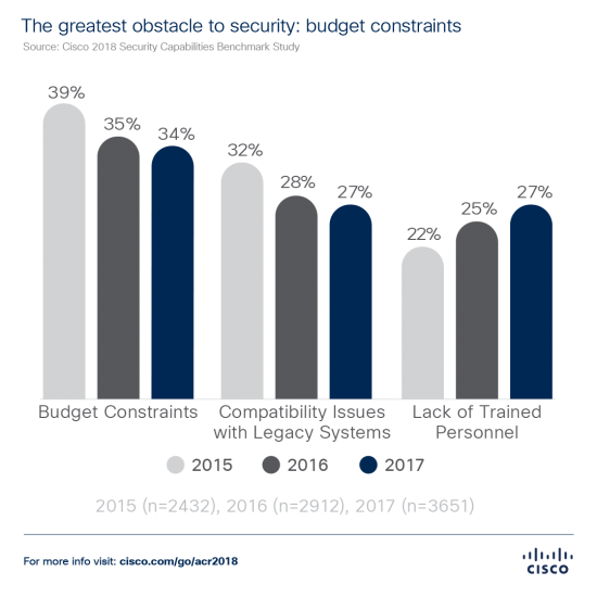 A majority of respondents cite budget restraints as the greatest obstacle they encounter in managing security. However, over the last three years, we have seen that number decline around 5%, while lack of trained personnel has grown 5% as the top cited obstacle.