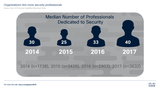 With all of these obstacles, we also find a growing trend in how organizations manage their security resources. According to the Cisco Annual Cybersecurity Report, outsourcing monitoring services grew from 42% in 2014 to 49% in 2017; security consulting services increased from 51% to 54%; and Incident Response services from 45% to 47%. IT and security leaders are realizing they cannot hire enough “eyes on glass” to meet today’s demanding security environment, and are turning to outside sources to find best practices for their security programs and processes, and to help to identify efficiencies in their complex systems.