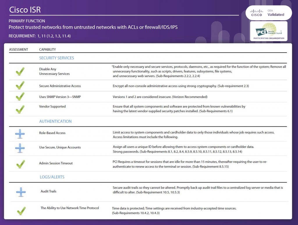 The Cisco Compliance Solutions team has worked with a global qualified security assessor, Verizon Business/Cybertrust, to develop a simple metric for reducing the complexity around the capabilities needed to support PCI. This capability metric also helps vendors like Cisco develop secure products that maintain compliance. The logic was pretty simple, actually. The process involved analyzing every sub-requirement within the standard that stated a service capability. For example, PCI DSS Requirement 8 talks about the need for unique IDs for administrator accounts. PCI states that you can’t use general administrator accounts because it would be unclear who executed a command that resulted in a breach. Okay. So each piece of technology that is in scope has the capability requirement of using unique IDs. PCI DSS Requirement 10 states that technology must have time synchronization using Network Time Protocol (NTP). Okay. So each piece of technology must be able to use NTP. Get the idea? All of these requirements are grouped into logical buckets for simplification. The result is following: