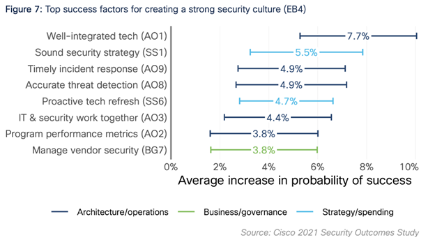 Creating and shaping a security culture requires a focus on usability, services, accurate alerting, awareness, and well-integrated change processes. Culture management needs time and attention, alongside staples like asset management or vulnerability management, in the overall security strategy. The Cisco Security Outcomes Study states “the strategy-culture correlation is worth calling out specifically. This is the only outcome in the ‘Enabling the Business’ category for which having a sound security strategy significantly increases the probability of success. That may seem odd, but consider that many a frustrated employee has asked something to the effect of ‘why do we have to go through all of this?’ in response to new security policies. A good strategy eases that frustration by getting everyone on the same page.”