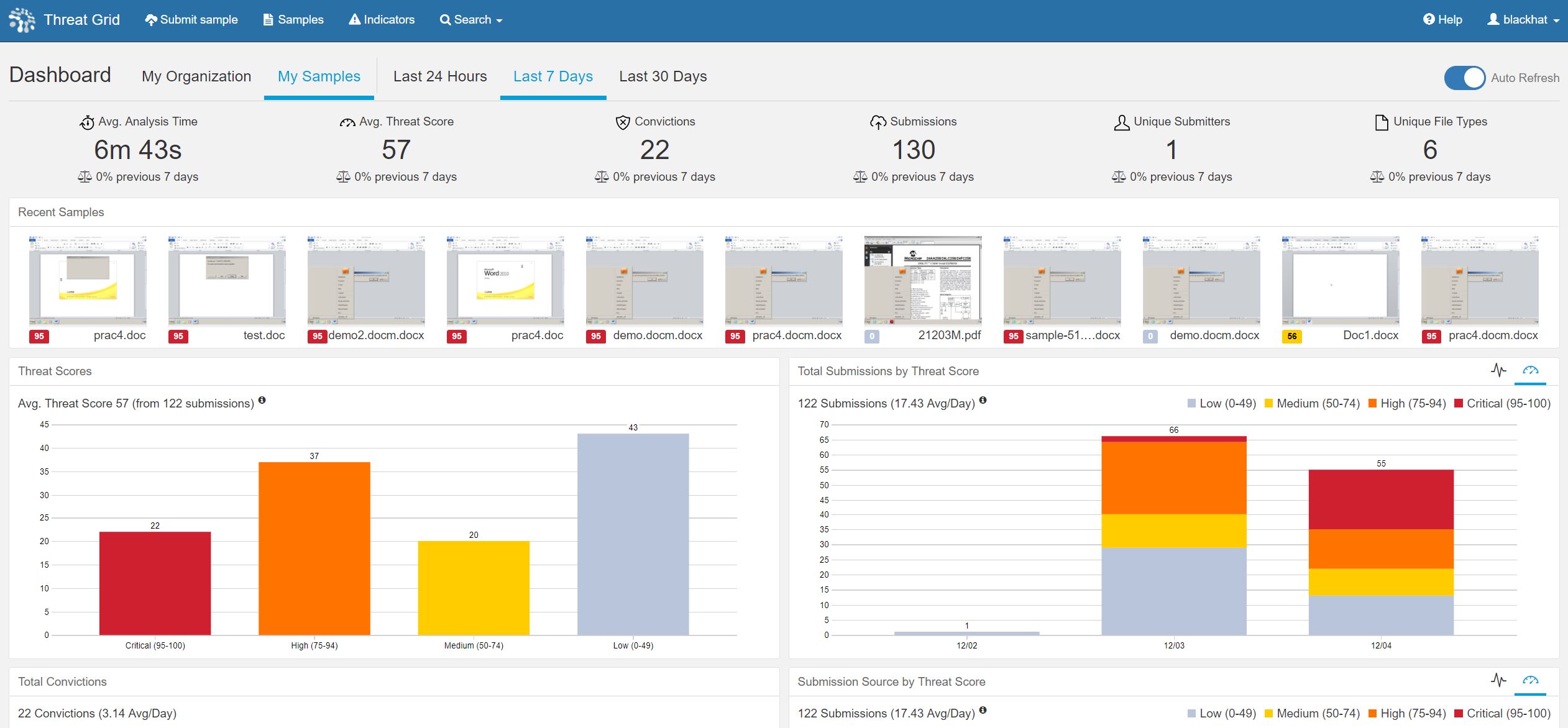The dashboard can be one-click configured to view My Organization or My Samples by the last 24 hours, last 7 days and last 30 days. An Auto Refresh control pulls the latest data, which we enabled for the SOC, along with the last seven days to have visibility for the entire conference.