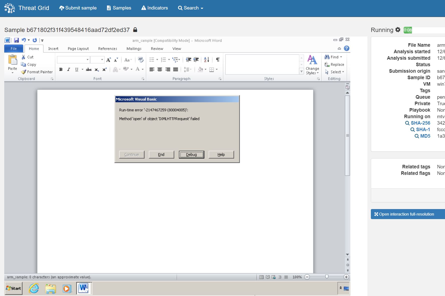 The thumbnail allowed us to see Word loading to launch the documents, as well as any pop-ups. Clicking on the thumbnail while the sample is running gave us accesses the unique Interact with Running Sample feature, also known as Glove Box.