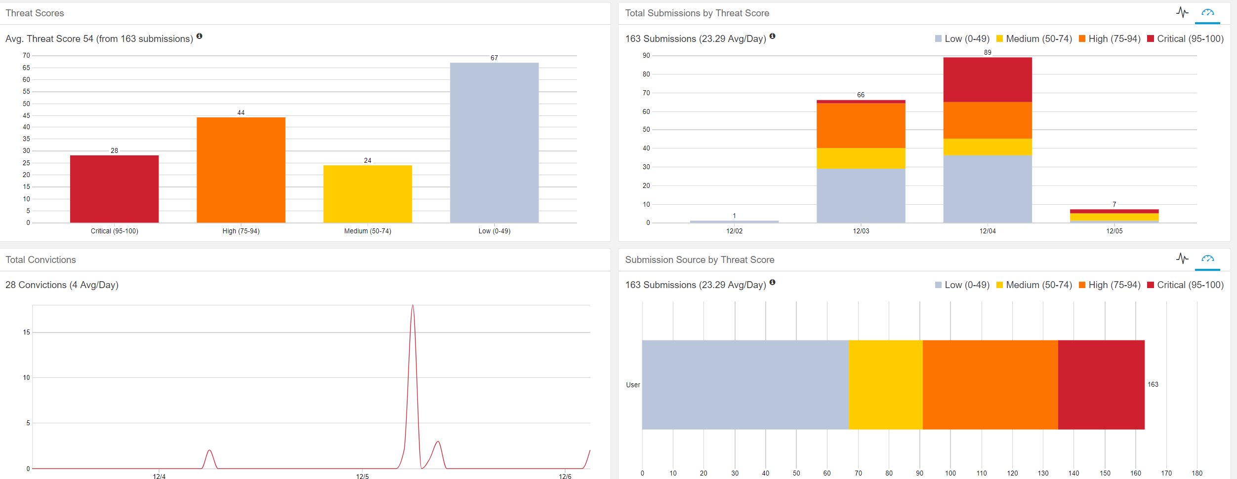 - Total Submissions stacked bar chart: Samples grouped by submissions, graphed by count over a configurable time period, and stacked by status or threat score