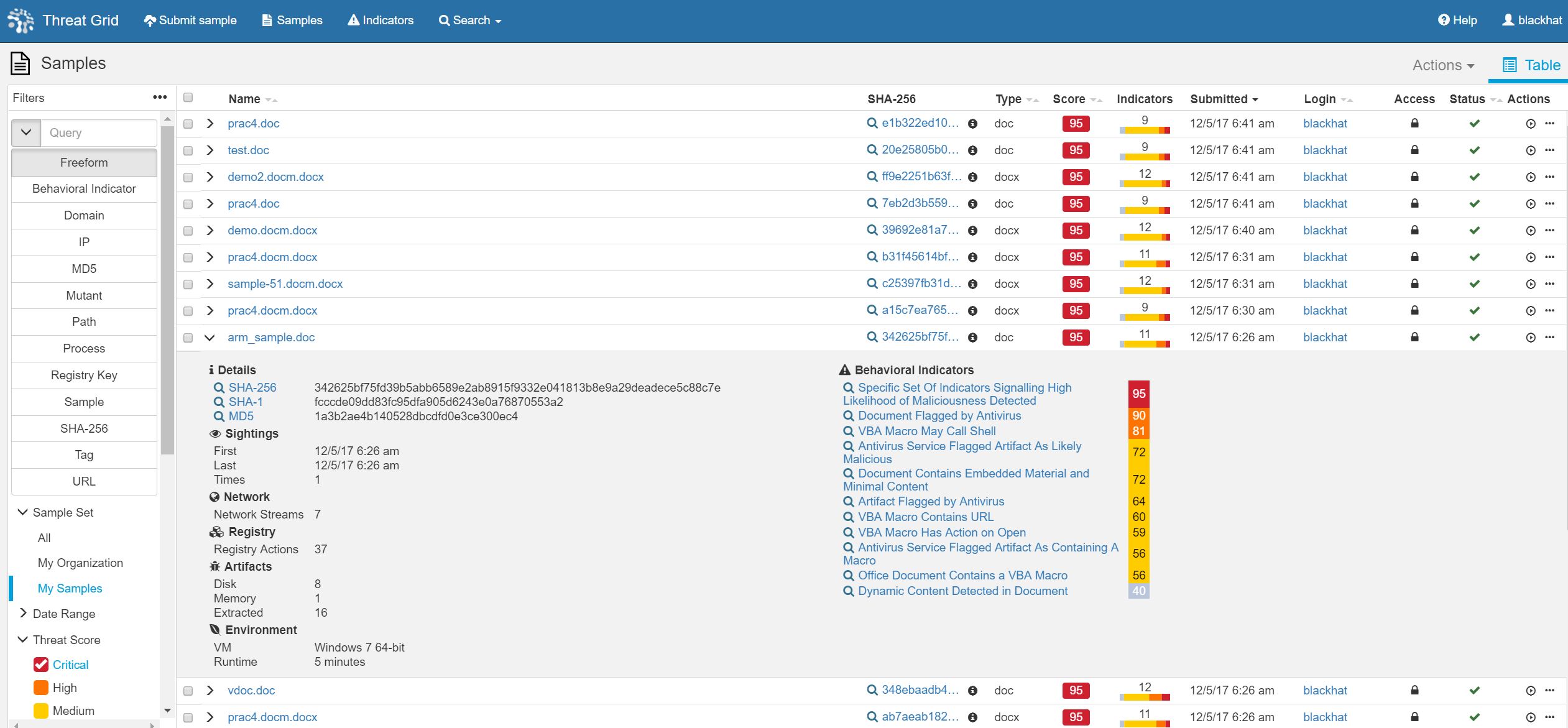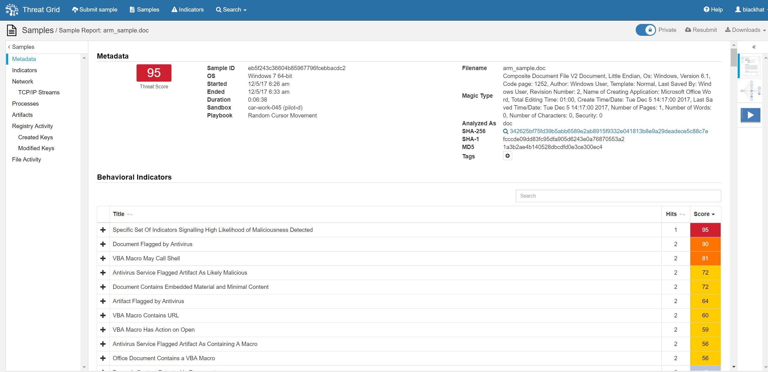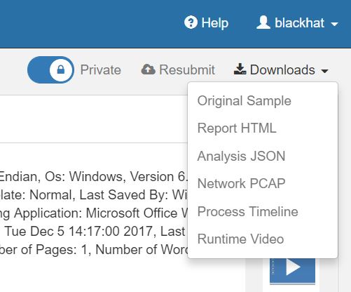 The contents of the document file remain private to the Black Hat organization, because by default all samples submitted to Threat Grid cloud via AMP products or RSA NetWitness Packets are marked as Private. The user can manually choose to share the sample with a simple toggle switch. You can also download the sample, the analysis report in HTMP or JSON, the full PCAP of network communication process timeline and watch the runtime video (both automated and/or manual interaction).