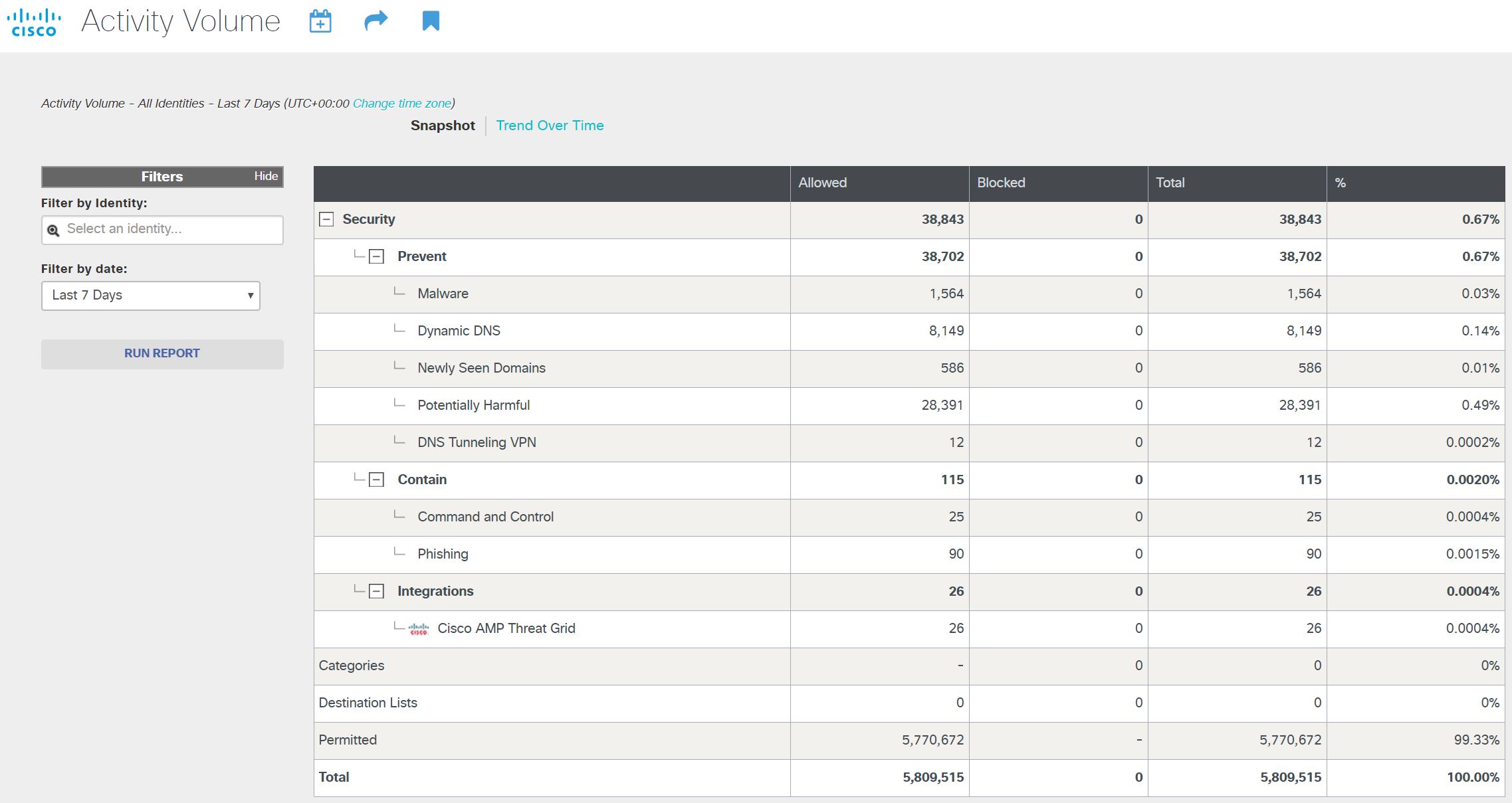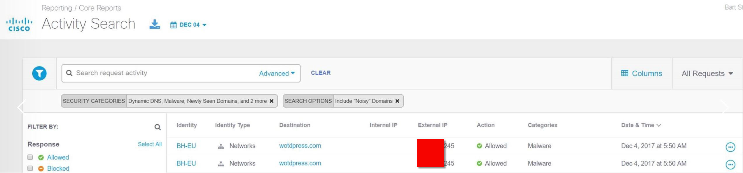 By default, Umbrella will begin blocking DNS traffic to sites known to host Malware, to Command and Control Callback servers and Phishing Attacks. At Black Hat, we always want to enable all traffic, so the trainers and briefers can show the latest exploits, and we kept the settings from Black Hat USA.