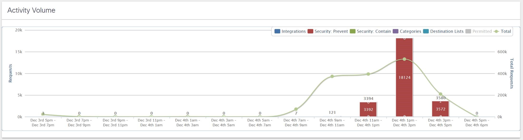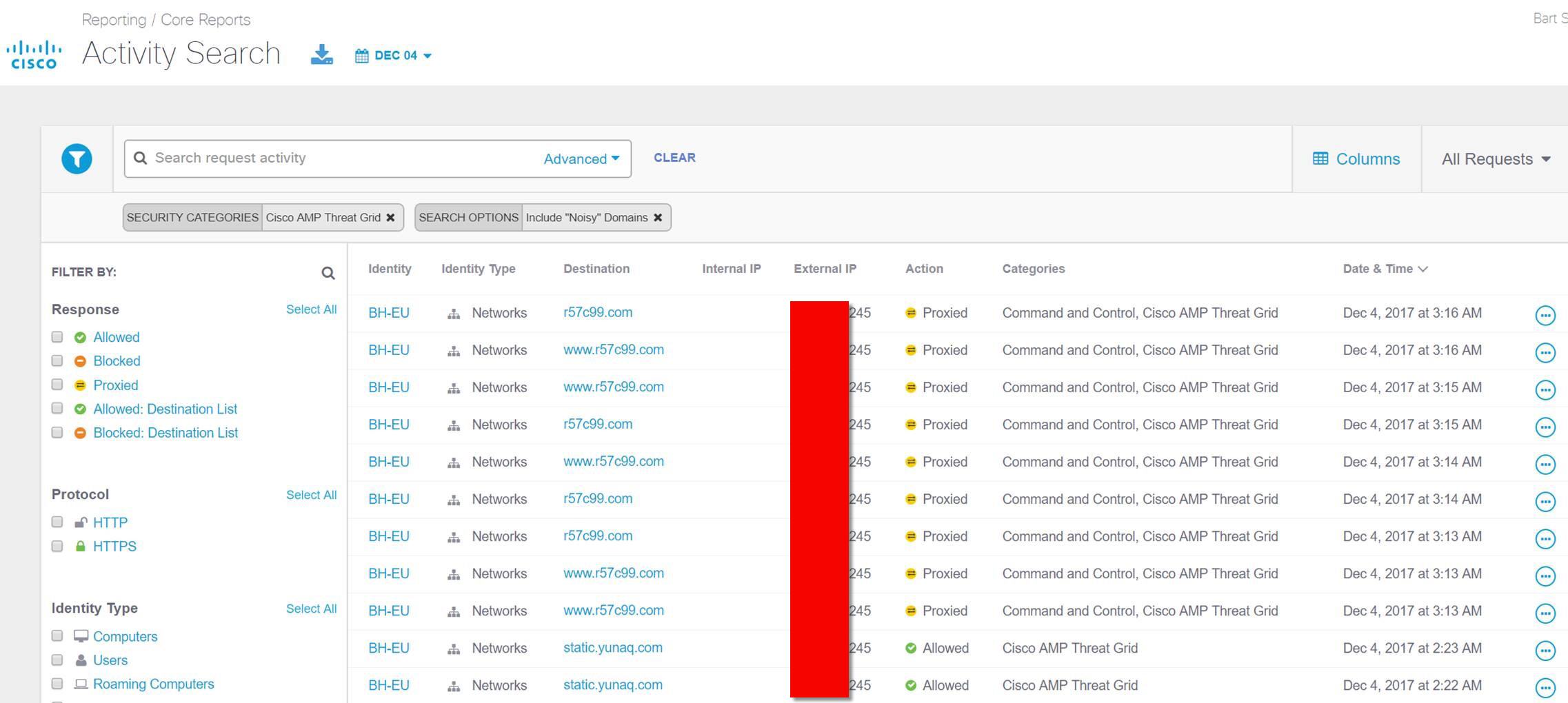 After joining the Black Hat NOC in Las Vegas last July, Cisco Umbrella was again used for DNS visibility and investigation. We added in the Network ranges provided by Gigamon for the conference, and DNS visibility began within an hour. We also enabled the Cisco Threat Grid intelligence feeds integration, by adding in the Black Hat’s Threat Grid API key.