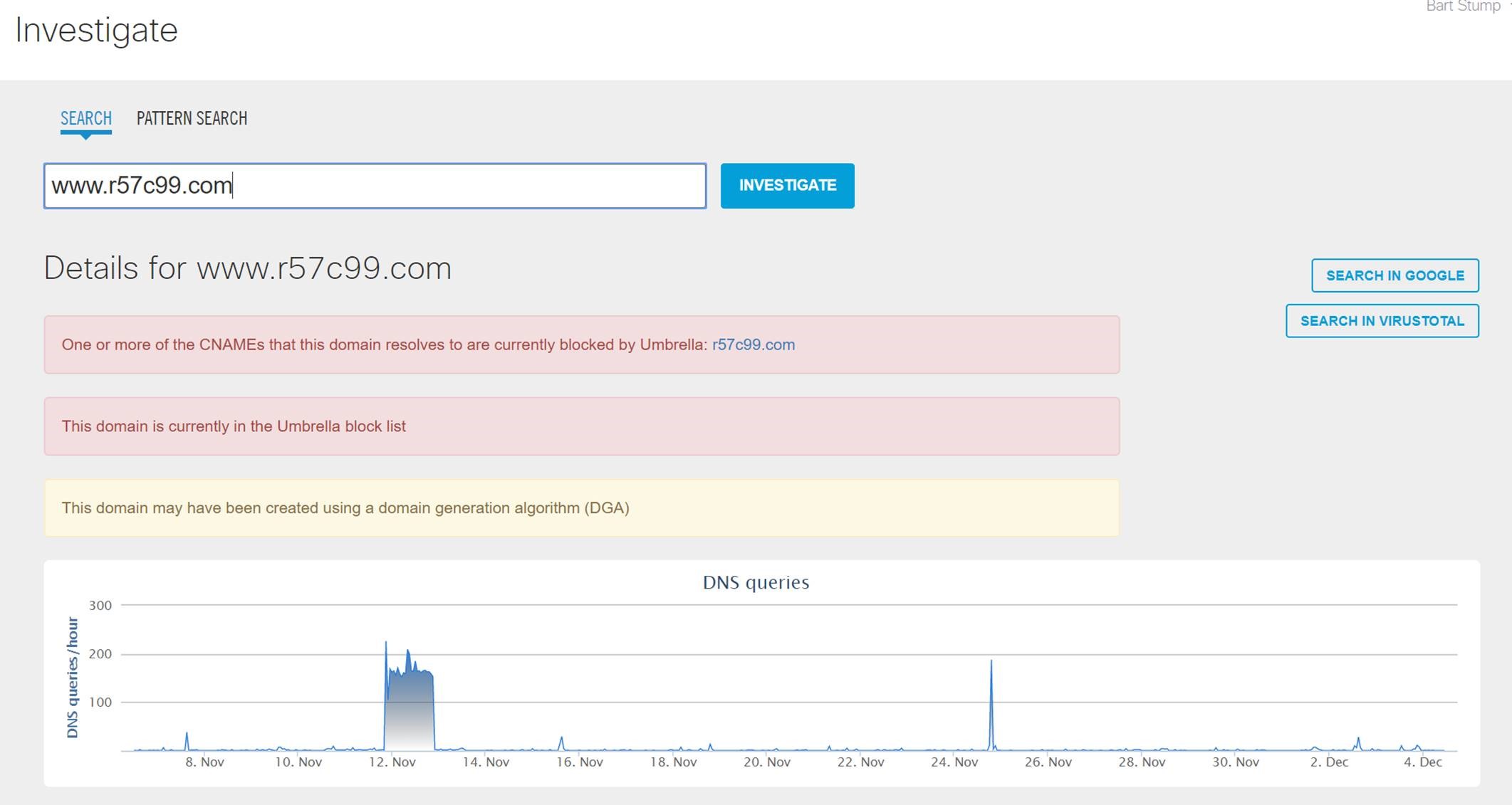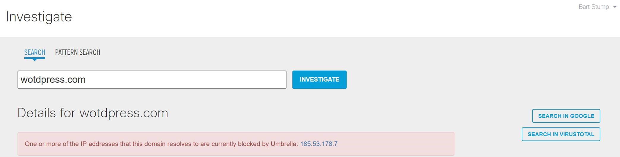 Following the alert into Umbrella Investigate, we were able to understand greater context.