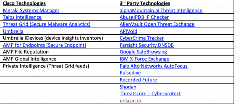The Cisco threat hunting team investigates potential threats in SecureX threat response, which was integrated with 20+ Cisco and partner threat intelligence platforms.