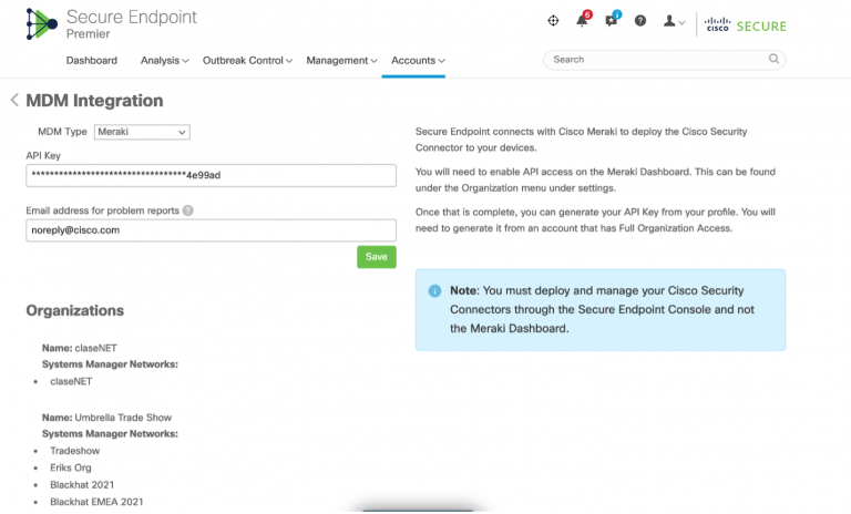 Meraki, Umbrella, and Secure Endpoint offer a tight integration that’s also very easy to configure. Let’s go over the simple configuration steps to add Clarity to the CSC app. First grab your API credentials from the Meraki SM dashboard and paste them into the Secure Endpoint console under Accounts -> Organization -> MDM Integration: