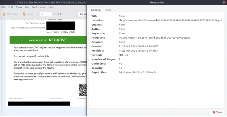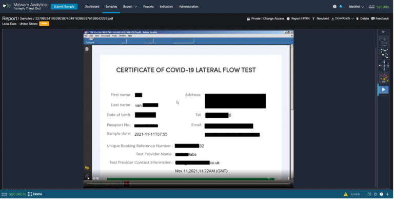 Malware Analytics analyzed the file using the Random Cursor Movement with Image Recognition playbook. While analyzing the file, I noticed the PDF file appeared to be a negative COVID-19 test.