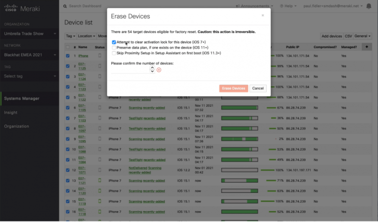 At the conclusion of the conference, we employed one of the strongest use cases for leveraging Meraki SM: en masse remote wiping before being returned to the contractor. This ensured that any data and applications that resided on the device were removed. Again, wiping 70 devices (Black Hat USA 2021 had 300 devices!) would take a considerable amount of time: from the Meraki SM dashboard, this took three mouse clicks!