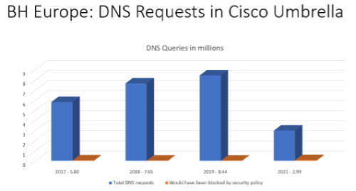 For several years, Cisco Umbrella provided DNS security for every Black Hat Conference around the globe. From Las Vegas to London to Singapore, we’ve monitored and analyzed DNS traffic with Umbrella, hunted and validated threats with Umbrella Investigate, and (when needed) mitigated domain or cloud application-based threats via DNS.