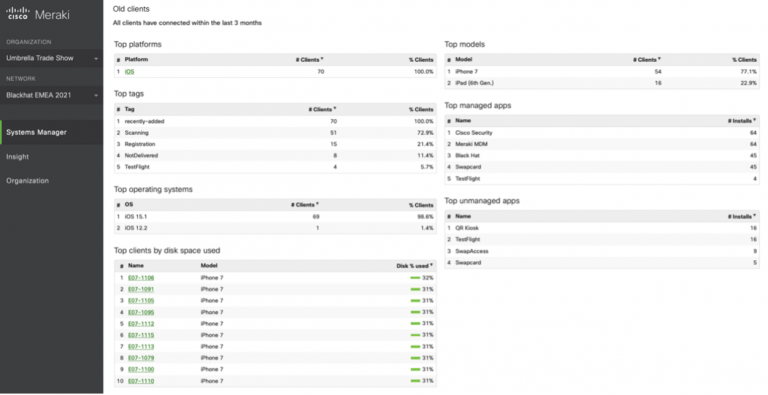 Cisco Secure also protected 14 iPads used for the Black Hat conference registration and 48 iPhones for sponsor lead retrieval, with the Cisco Meraki Systems Manager (SM) mobile device management (MDM) platform, with security through the Cisco Secure Endpoint for iOS/Security Connector.