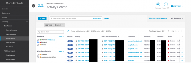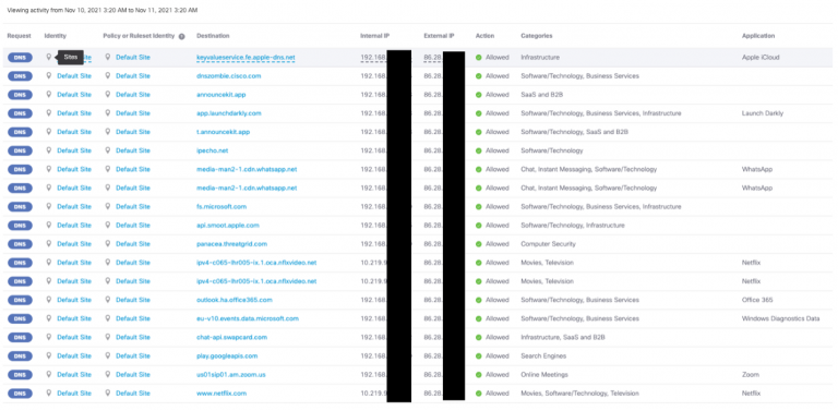 After some usage of the devices, data started to be visible in the Umbrella dashboard. There’s more about this configuration shortly.
