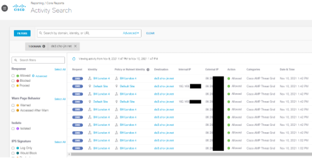Traditionally, Umbrella VA are used for active directory policy integration and user attribution. By leveraging our Umbrella VAs here in London, we’re able to see the source IP for all requests that were made, giving us the ability dig deeper into devices that are making suspicious requests. This allowed us to zero in on the full breadth of activity on a potentially compromised machine. Chances are that if a machine is making a request to malicious destination, it will likely call out to other malicious destinations as well.