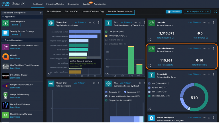 In the NOC, we kept the Umbrella organization (org) for the iPads and iPhones is separate from the Umbrella org for the conference network. This allows us to keep a distinct separation between which traffic is from the iPads/iPhones and which is from the conference network. The conference Umbrella org does not block any requests since we do not want to interrupt demos or any network activity. However, the iPad/iPhone org has full DNS security protection. We added both Umbrella orgs as separate tiles in the SecureX dashboard, so we can have a unified method of monitoring high level statistics.
