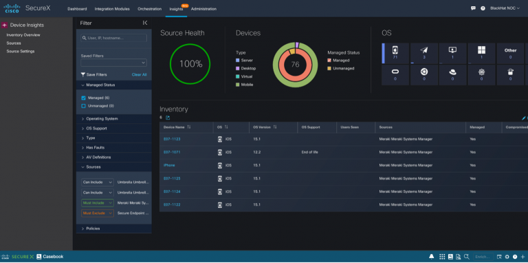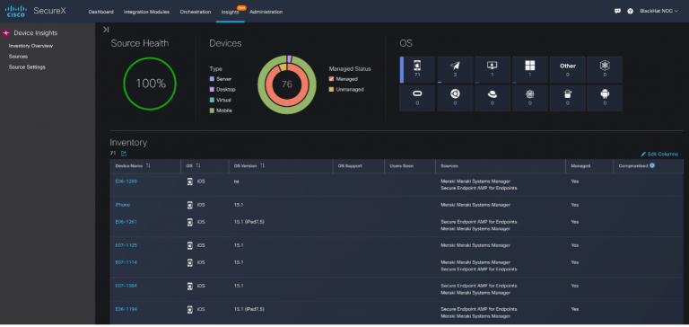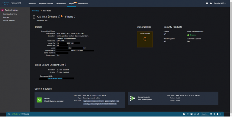 With the iOS devices fully protected and configured, it was a great opportunity to try out a new feature in SecureX that is still in beta called SecureX device insights. Device insights provides a seamless, agentless, unified view of the assets in your environment for attack surface reduction. SecureX device insights can take data from multiple sources and merge them to create a single unified record to have all the information about that particular endpoint in one place. For us at Black Hat, we used device insights to show us a single record for our iPads and iPhones with data from both Secure Endpoint and Meraki SM.