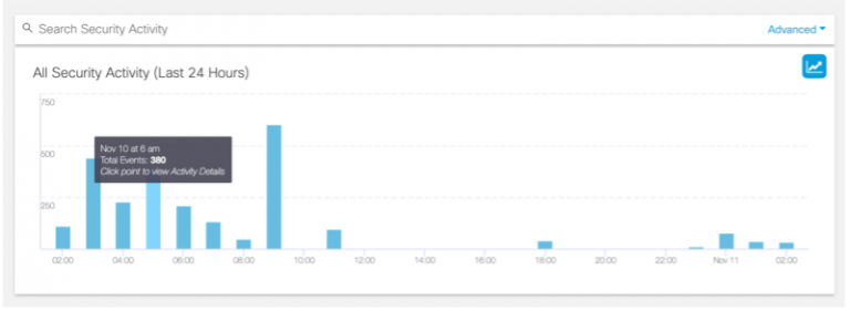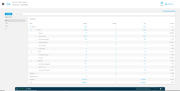The Umbrella Activity Volume report allowed us to quickly aggregate events, and also use it to drill in for threat hunting.