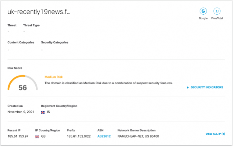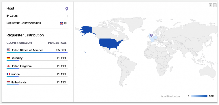 Although the nascency of the domain triggered Umbrella’s security alert warning, another data point that Umbrella Investigate provides is the geographical disparity between where the domain is registered, and where the requests for it originate. The domain was registered in Iceland, but majority of connections to it were coming from the United States.