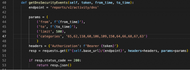 The database is stored on a Docker volume that can be mounted by our second container, the Meraki-Mapper. Though this container’s primary purpose is building the heatmaps, it also performs the task of retrieving and correlating Umbrella DNS security events. That is, any DNS query from the Black Hat network that matches one of several predefined security categories. Umbrella’s APIs were recently improved to add OAuth and simplify the URI scheme for each endpoint. After retrieving a token, we can get all security events in the time frame of the current heatmap with one call.