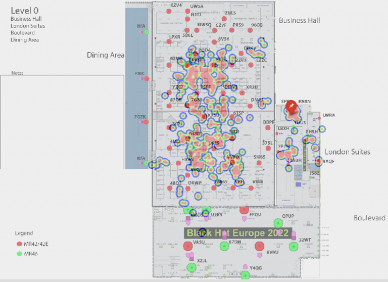 Over the previous Black Hat events, we have been utilizing Meraki scanning data to get location data for individual clients, as they roamed conference. In the initial blog post (Black Hat Asia 2022), we created a Docker container to accept the data from the Meraki Scanning API and save it for future analysis. At Black Hat USA 2022, we wrote about how to use Python Folium to use the flat text files to generate chronological heatmaps that illustrated the density of clients throughout the conference.