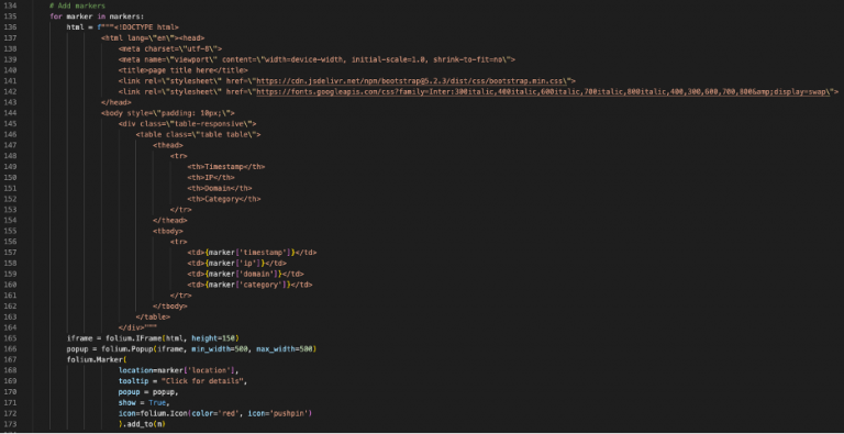 What we want to do with these events is to create Folium Markers. These are static “pins” that will sit on the map to indicate where the DNS query originated from. Clicking on a marker will popup more information about the query and the client who sent it.