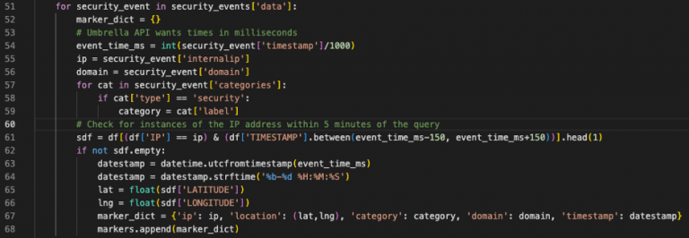 Thanks to the Umbrella Virtual Appliances in the Black Hat network, we have the internal IP address of the client who sent the DNS query. We also have the internal IP address in the Meraki scanning data, along with the latitude and longitude. After converting the database query into a Pandas dataframe, our logic takes the IP address from the DNS query and finds all instances in the database of location data for that IP within a 5-minute window (the resolution of our heatmap).