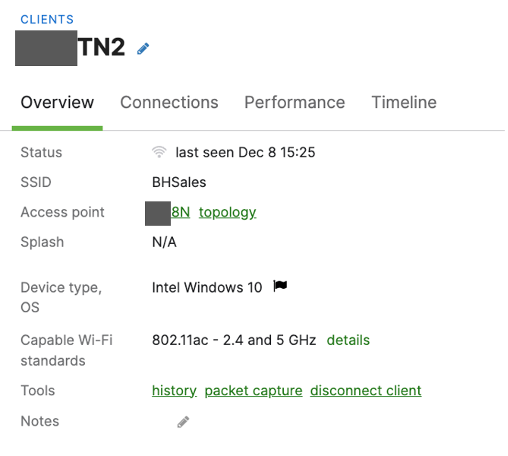 Knowing that there has only been one client associated with the address made finding the attendee easier. We then needed to know where they were and Meraki had this figured out. After opening the client’s profile, we saw what SSID and access point (AP) they were connected to using the Meraki location map.