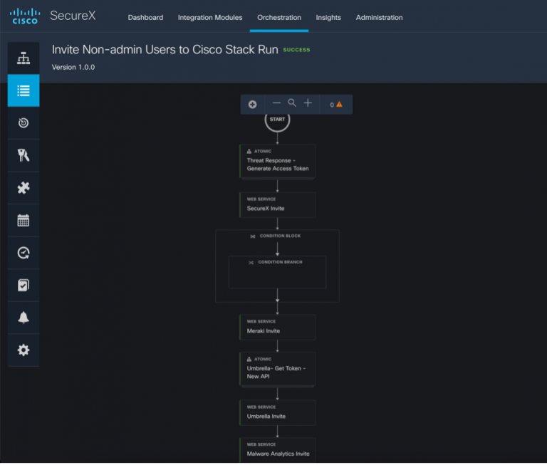 To automate this process, I developed two workflows: one to create non-admin users for NOC partners and one to create administrator accounts in all the tools for Cisco staff. The workflows create accounts in SecureX, Secure Malware Analytics (Threat Grid), Umbrella DNS and Meraki dashboard, all using SecureX Single Sign-On.