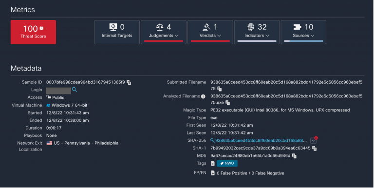 During the last day of Black Hat Europe, our NOC partner, NetWitness saw some files being downloaded on the network. The integration again automatically carved out the file and submitted the Cisco Secure Malware Analytics (SMA) platform. One of those files came back as a trojan, after SMA detonated the file in a sandbox environment. The specific hash is the below SHA-256: