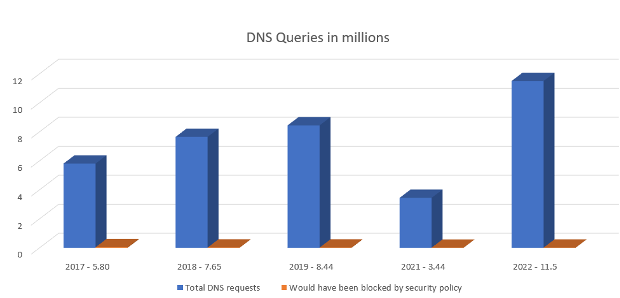 For years we have been tracking the DNS stats at the Blackhat conferences. The post-pandemic 2022 numbers look like we never skipped a beat after the dip in DNS queries from 2021, seen in the bar graph below. This year’s attendance saw well over 11 million total DNS queries.