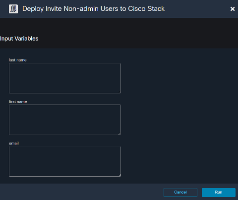 The workflow requires three inputs: first name, last name, and email. Click Run.
