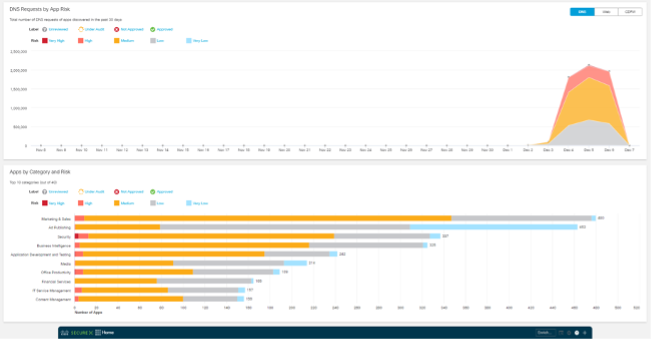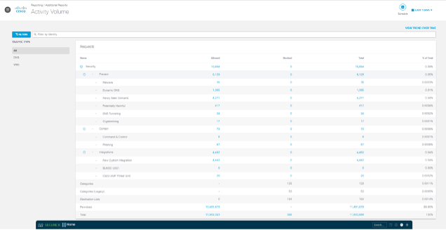 The Activity volume view from Umbrella gives a top-level level glance of activity by category, which we can drill into for deeper threat hunting. On trend with the previous Black Hat Europe events, the top Security categories were Dynamic DNS and Newly Seen Domains. However, it’s worth noting a proportionally larger increase in the cryptomining and phishing categories from 9 to 17 and 28 to 73, respectively, compared to last year.