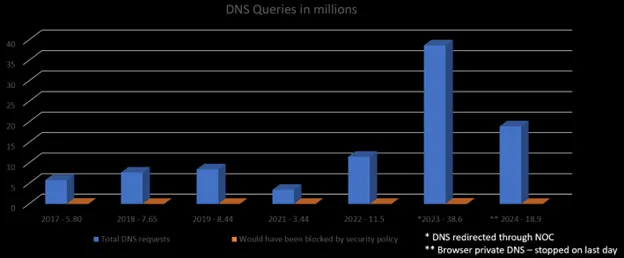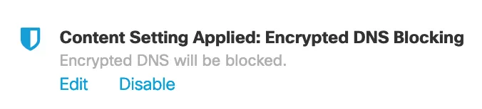 We presented our observations and recommendation to the NOC Leaders, who decided it would be best to try and block these protocols (DoT, DoH and Private Relay) for better visibility. The morning of last day, we added the policy to Umbrella.