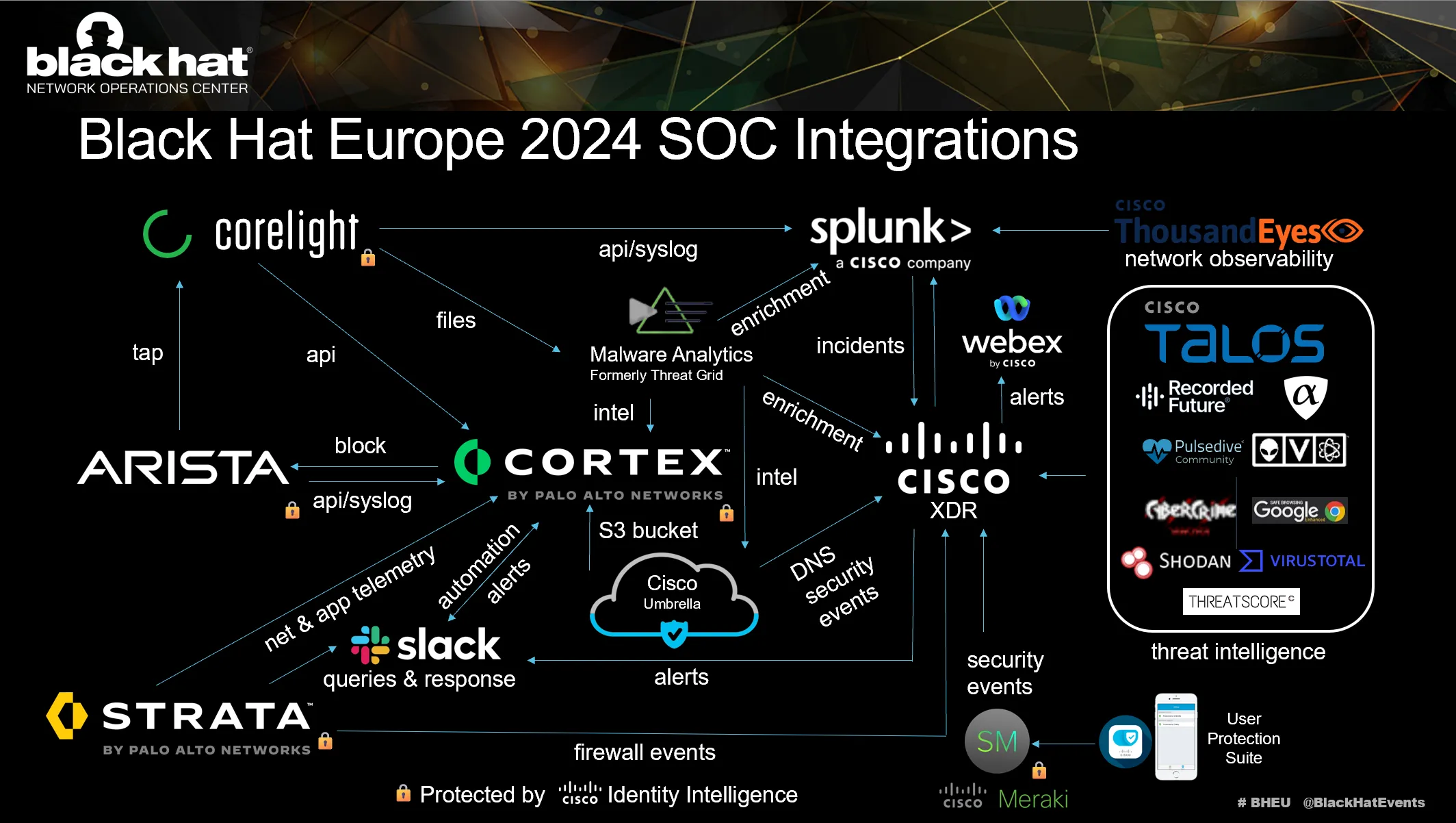We appreciate alphaMountain.ai, Pulsedive and Recorded Future donating full licenses to Cisco, for use in the Black Hat Europe 2024 NOC.