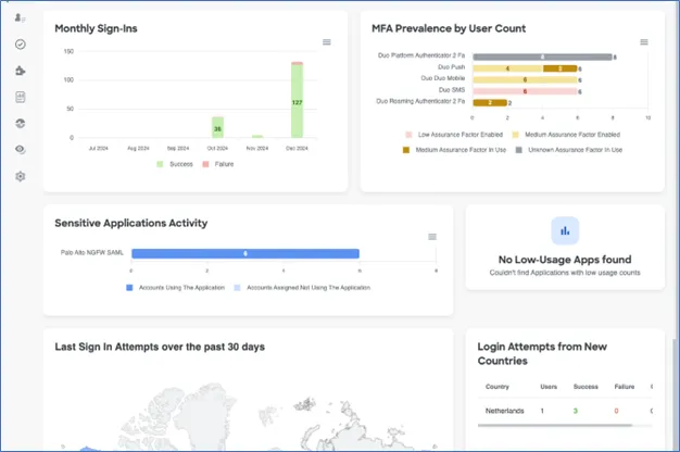 In the above screenshot, we can see the monthly sign-ins and whether they were successful or not. Also, the type of Multifactor Authentication (MFA) used by users, sensitive applications and the countries where logins were attempted from.