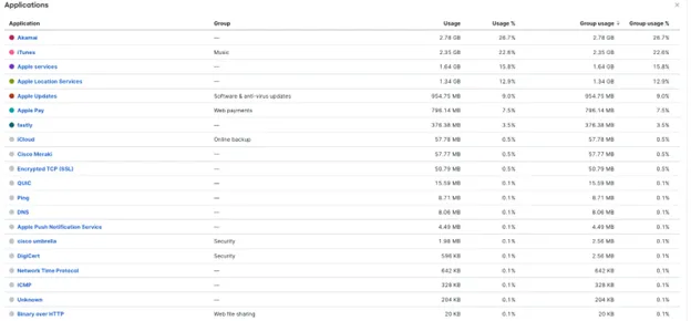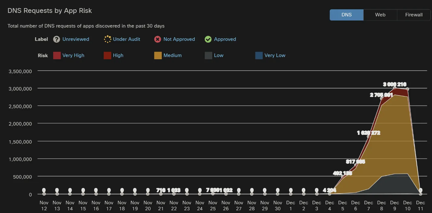 Umbrella tracks the unique apps connecting to network. We saw a marked increase in GenAI. If needed, we can block apps that demonstrate a threat to the conference.