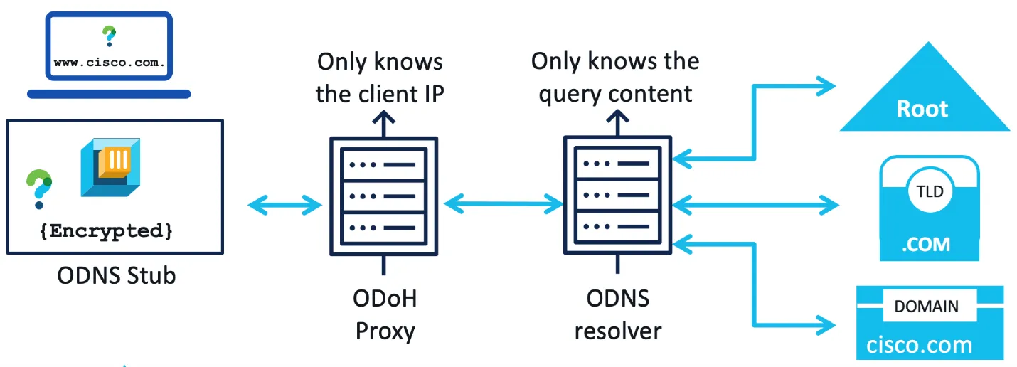 - The “first hop” recursive DNS resolver accepts receives the client lookup, but the client has done something sneaky to prevent this initial resolver from knowing what the domain name is that the client is looking for. It has wrapped the original query in an encrypted blob and added a bogus name to the “outer” message.