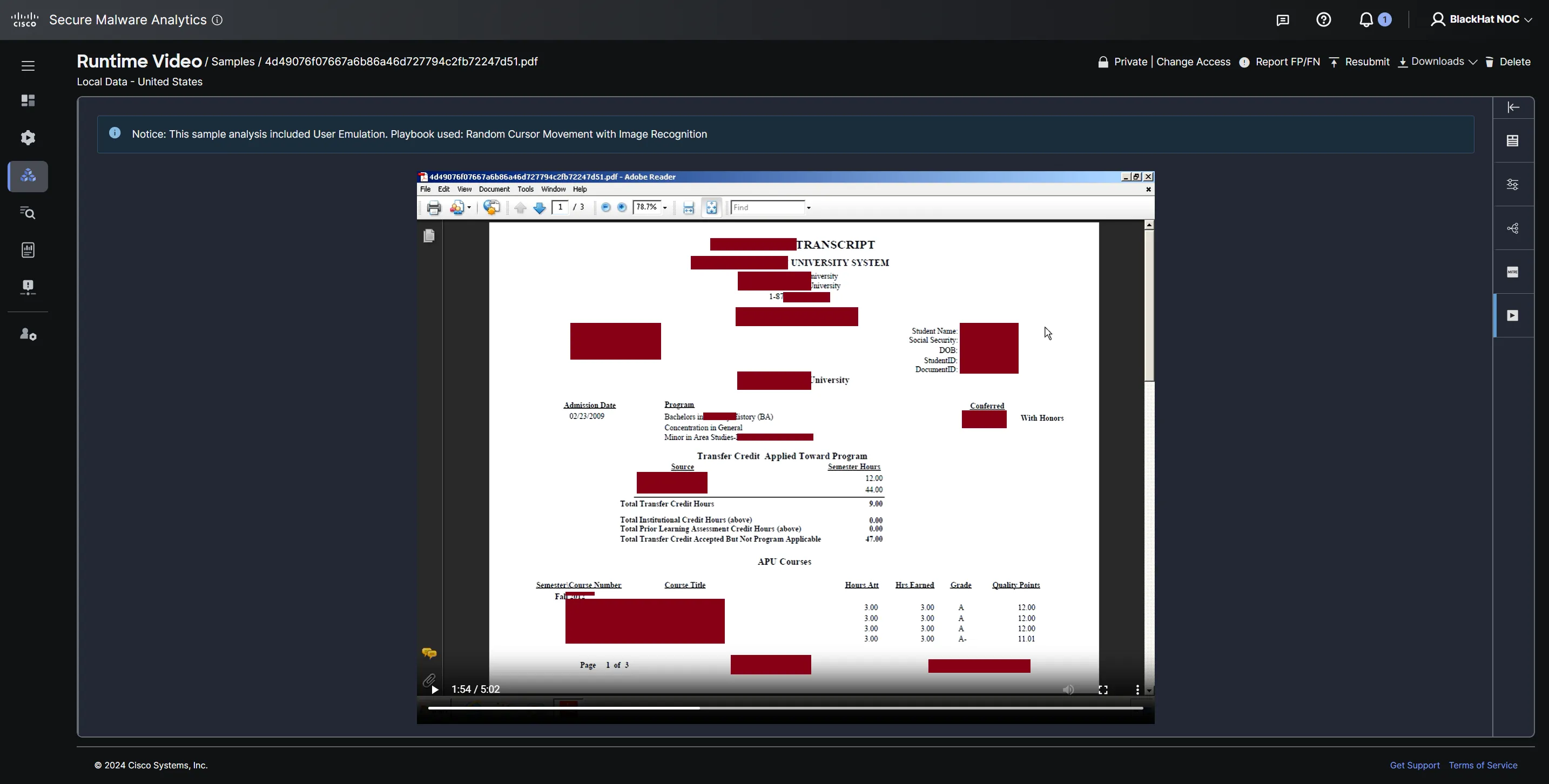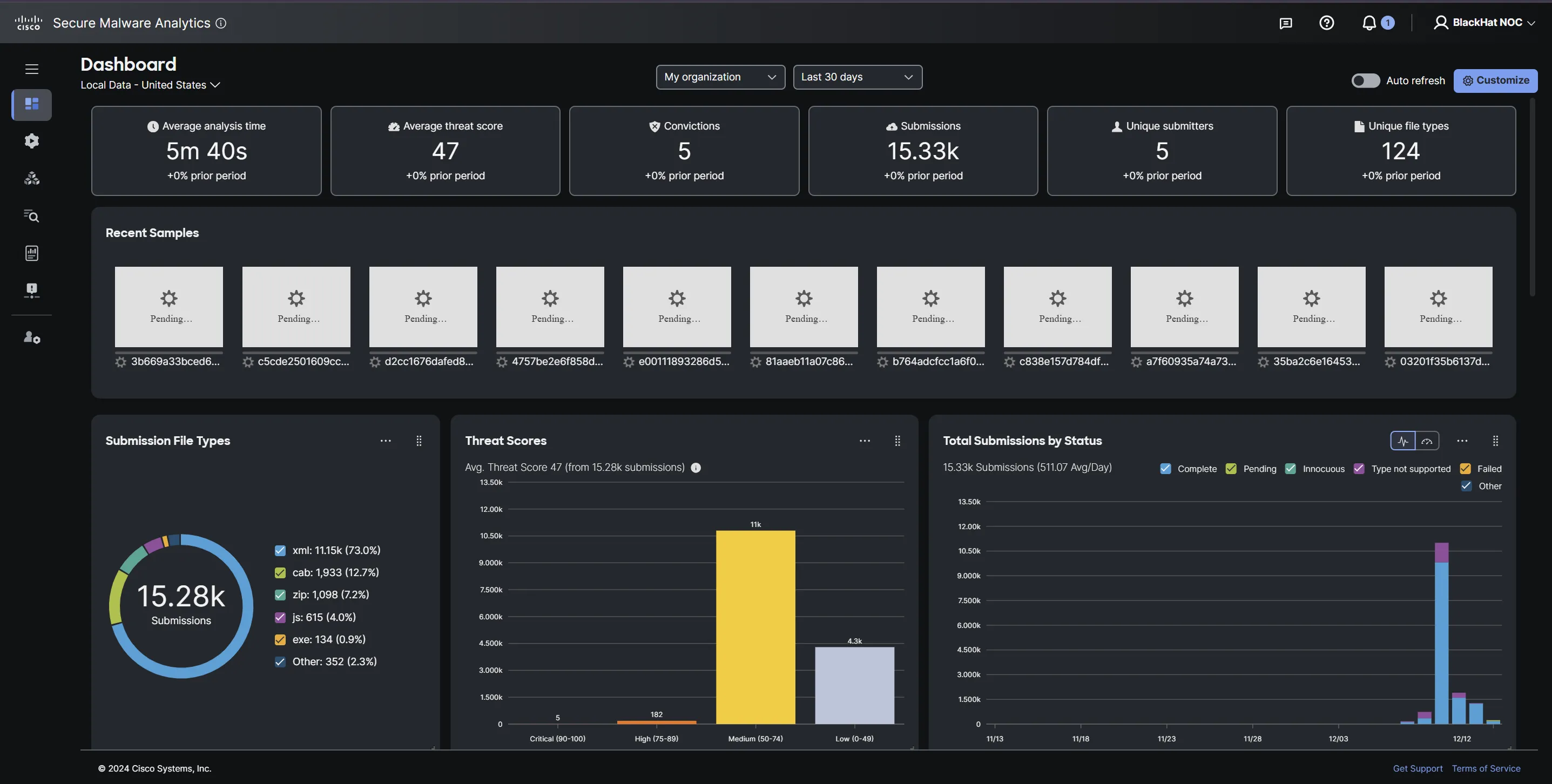 For Cisco, a core integrated function in the Black Hat NOC/SOC is providing the platform for our partners to send suspicious files to Secure Malware Analytics (aka Threat Grid) for dynamic malware analysis (aka sandboxing). We have expanded the integration over the years, with both Corelight OpenNDR and Palo Alto Networks Firewalls submitting samples. At Black Hat Europe 2024, over 12,000 supported samples were submitted.