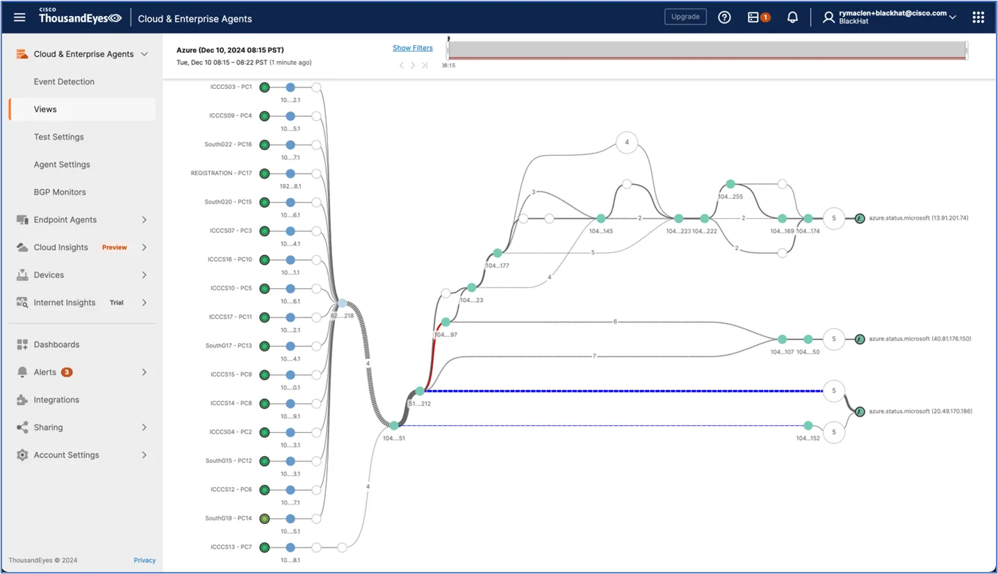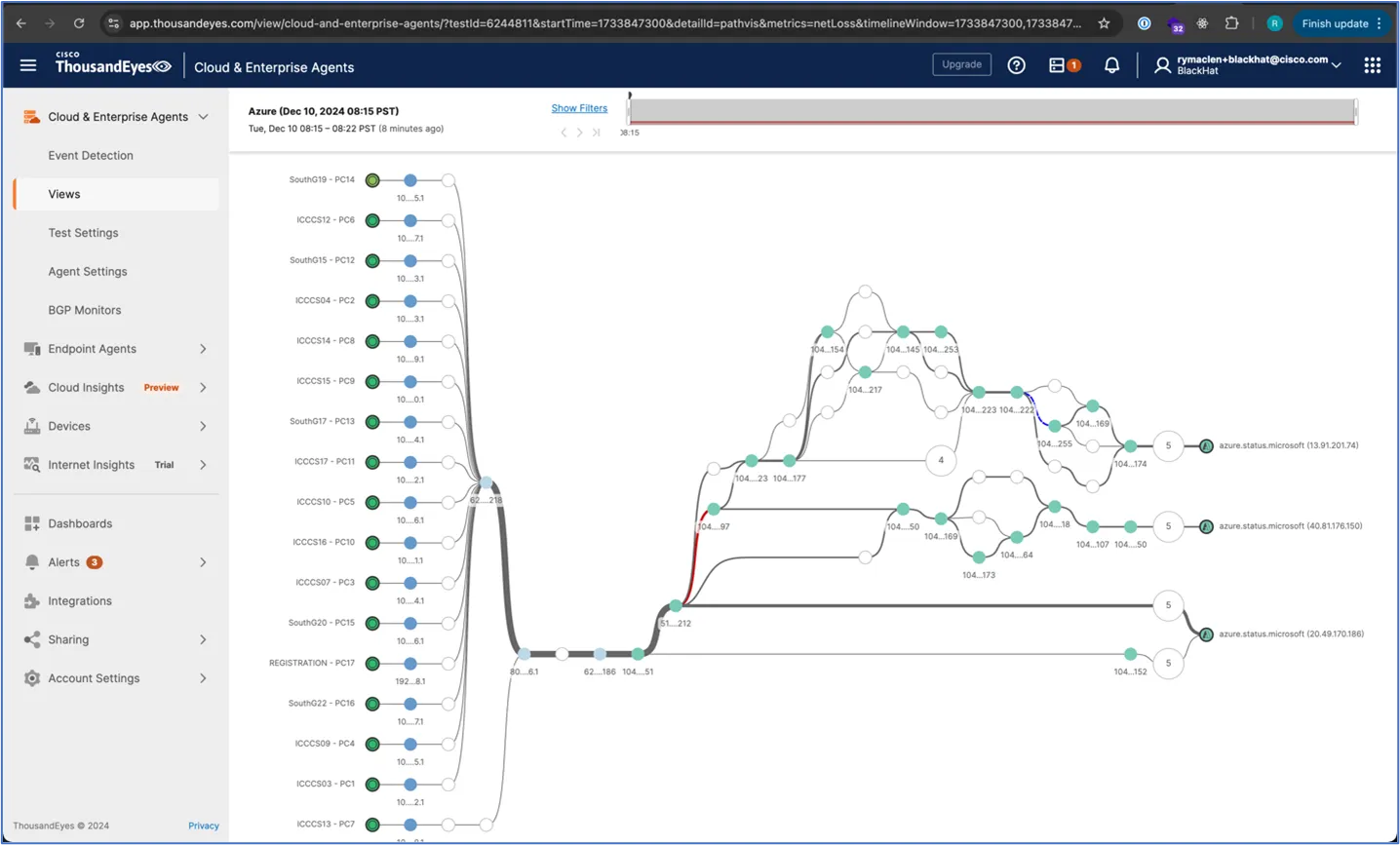 At Black Hat Europe 2024, we had a problem where the ThousandEyes agents were showing a high latency time to Azure. We were receiving calls about access to Azure being slow, but being the proactive NOC we are, we went ahead and investigated what is causing the high response time.